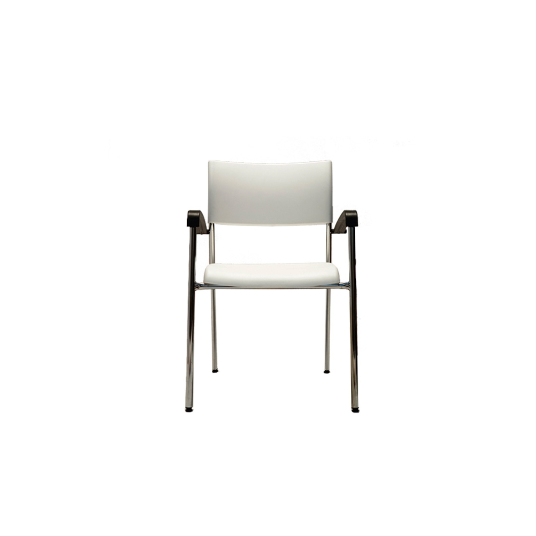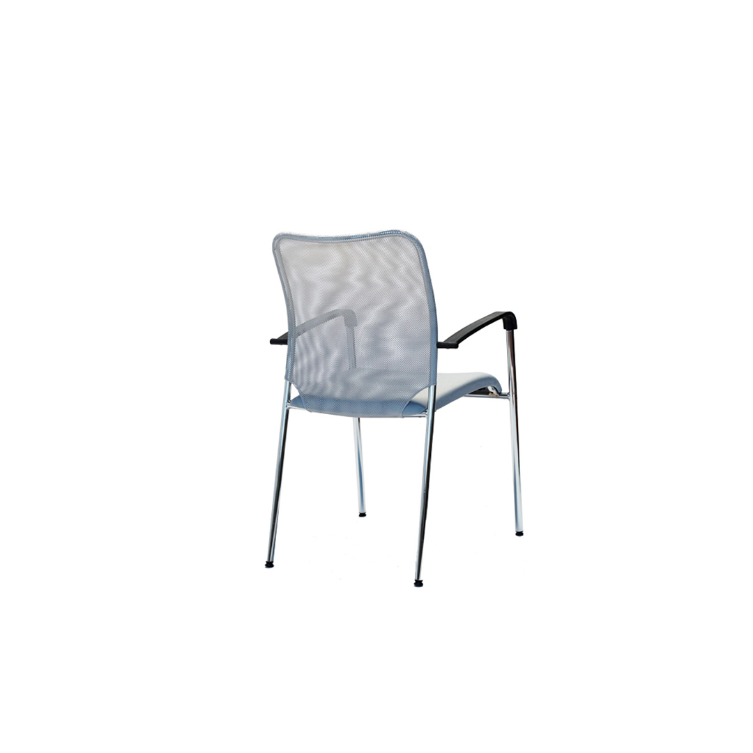 Silla fija de gran elegancia y hermosas formas. Su perfil minimalista marca su condición. Su estructura es de acero cromado o pintado, su asiento tapizado en variadas telas y colores y su respaldo está conformado en red tramada de alta resistencia de DOBLE MALLA. Disponible con o sin brazos. Es además apilable. Ideal para salas de reuniones, auditorios, visita o espera.