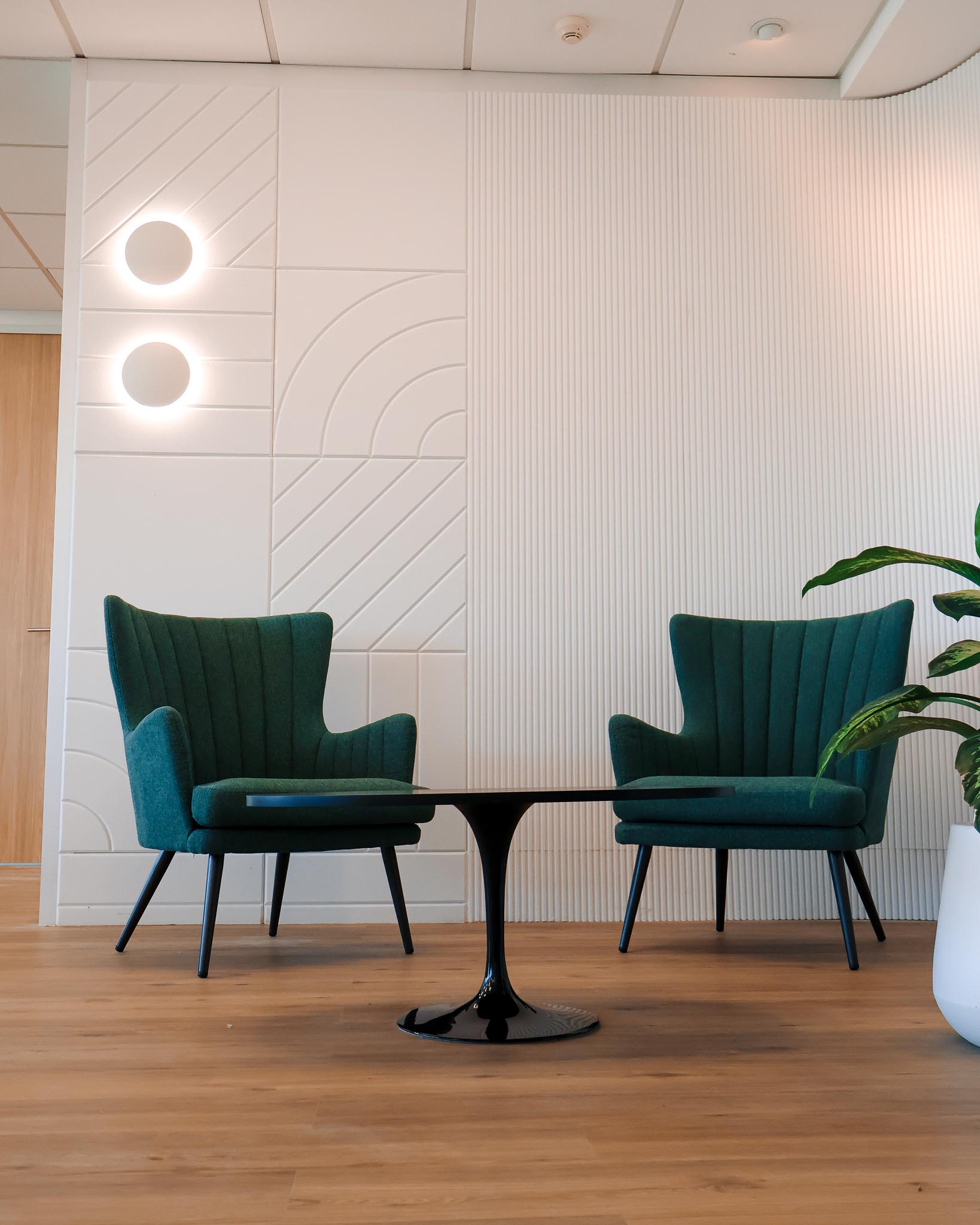 Área de relax diseñada para pausas activas, equipada con puffs, sillones confortables y paneles acústicos Beam, aportando confort, identidad y un diferencial estético.