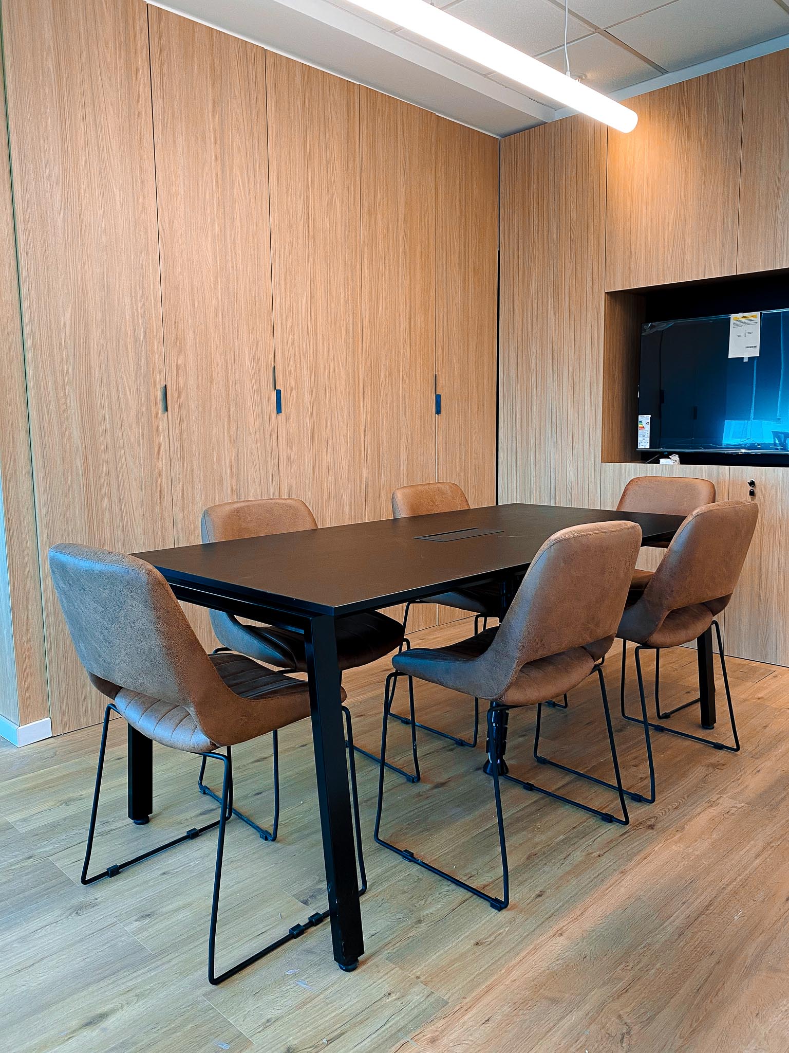 Mobiliario de línea Iron en terminaciones negro y sauca, pensado para un look moderno y sobrio. Se incorporan sillas VT y sillones Géminis, que garantizan confort, presencia y ergonomía para puestos directivos.